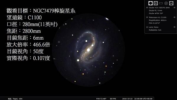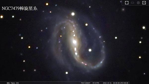 星系分類分為:橢圓星系、透鏡星系、螺旋星系、棒旋星系、不規則星系。NGC7479屬於棒旋星系,外觀有點像螺旋星系,但是不同的地方在於螺旋星系的旋臂環繞著核球中心。棒旋星系則是懸臂圍繞著穿過核球的棒子。